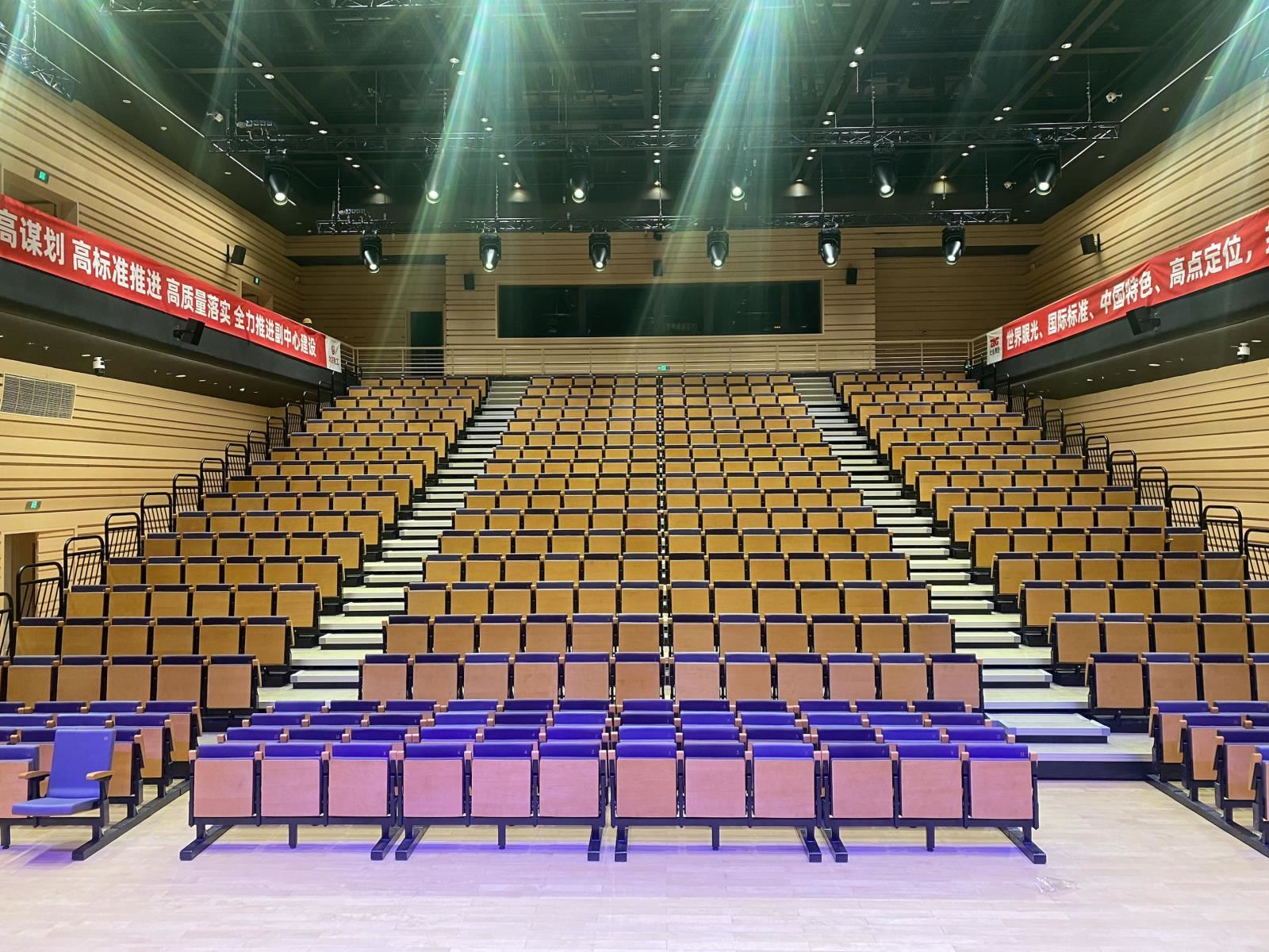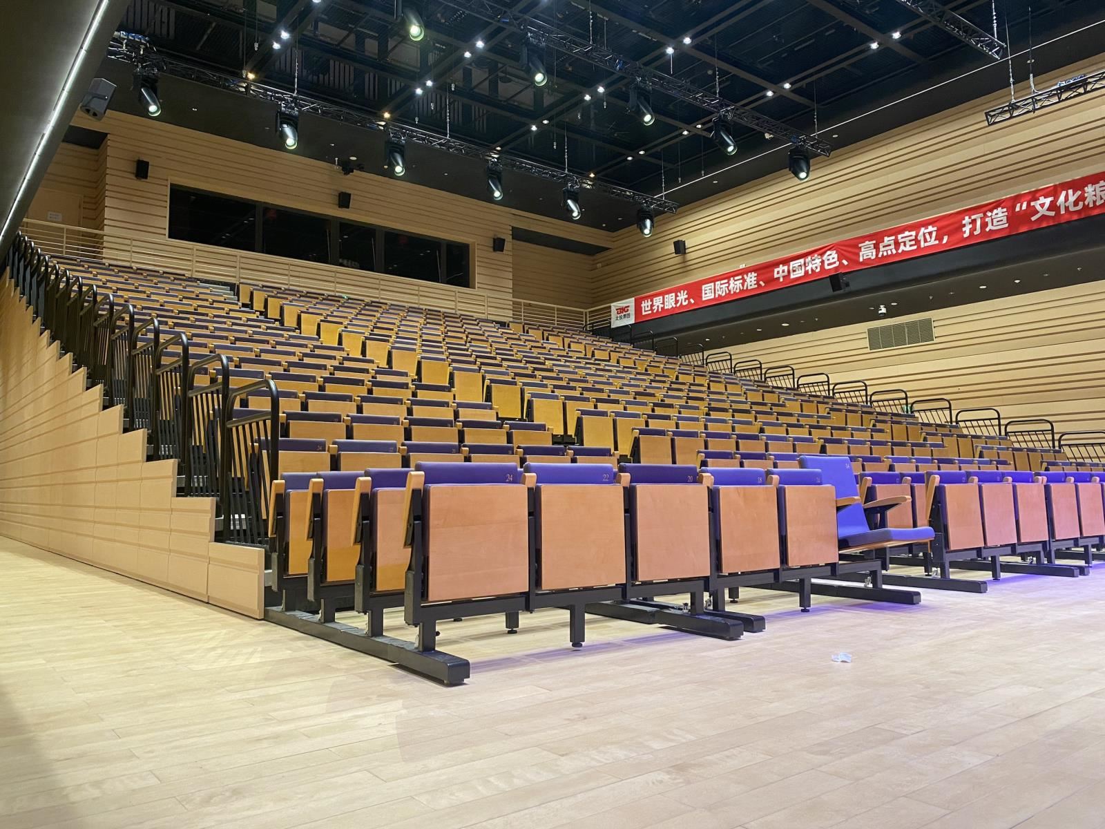 提高觀眾舒適度,電動或手動翻折;固定座椅通常為前置,即座椅安裝于臺階邊緣。