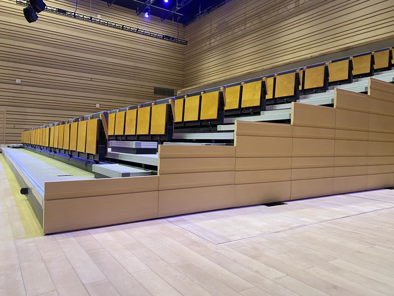 活動看臺可電動展開和收攏,當排數(shù)較少時,也可以采用人工的方式展開和收攏。